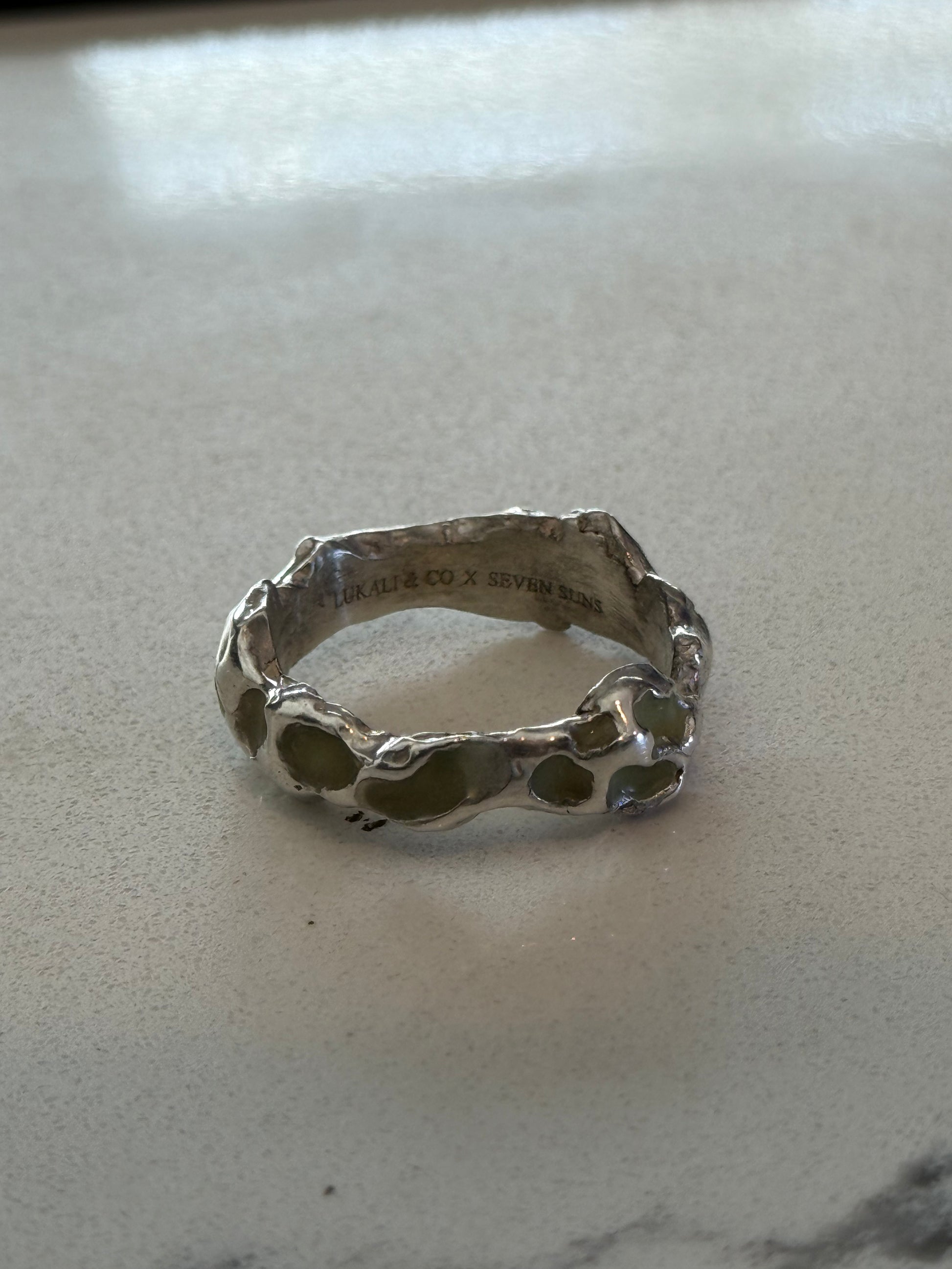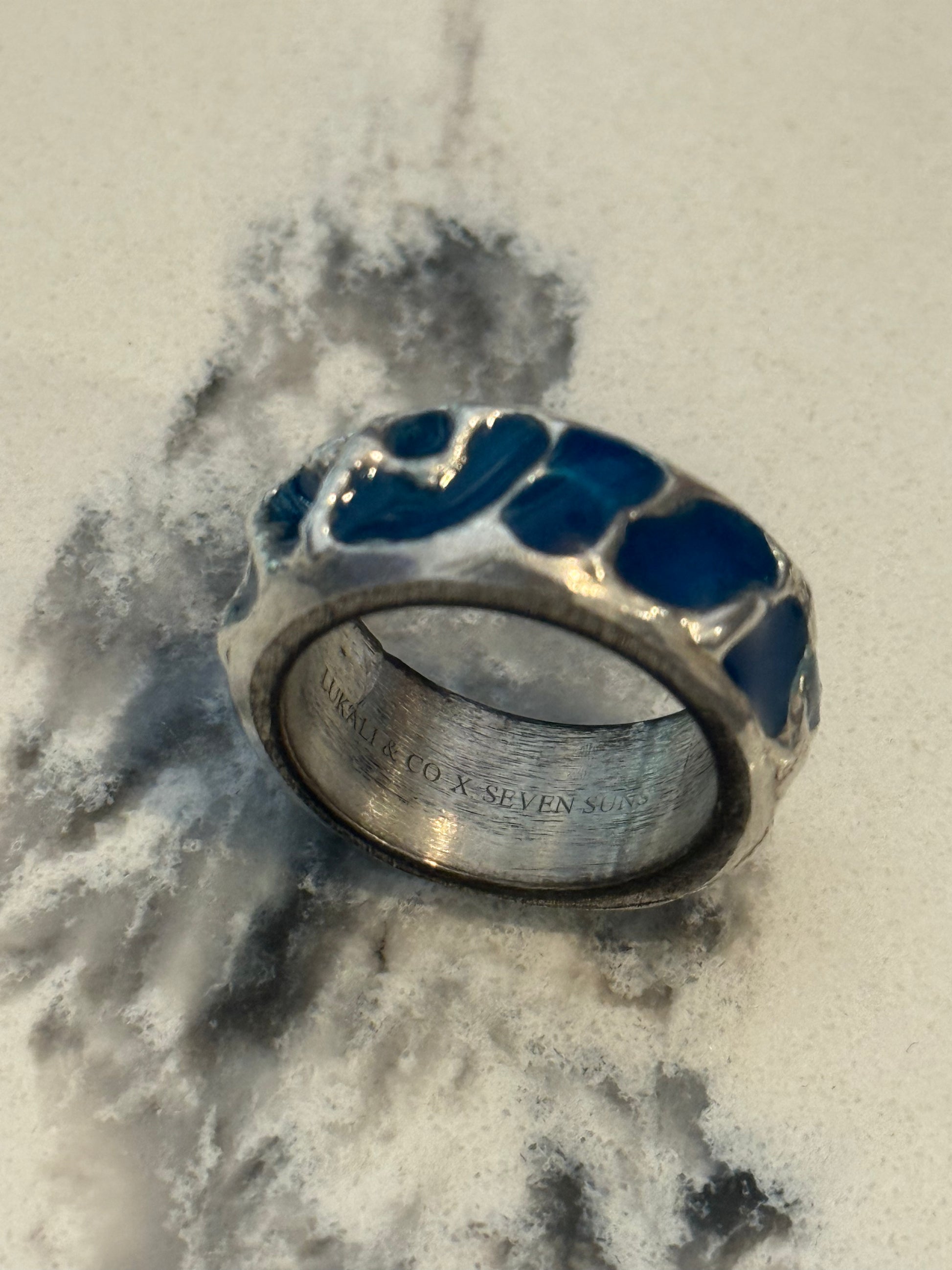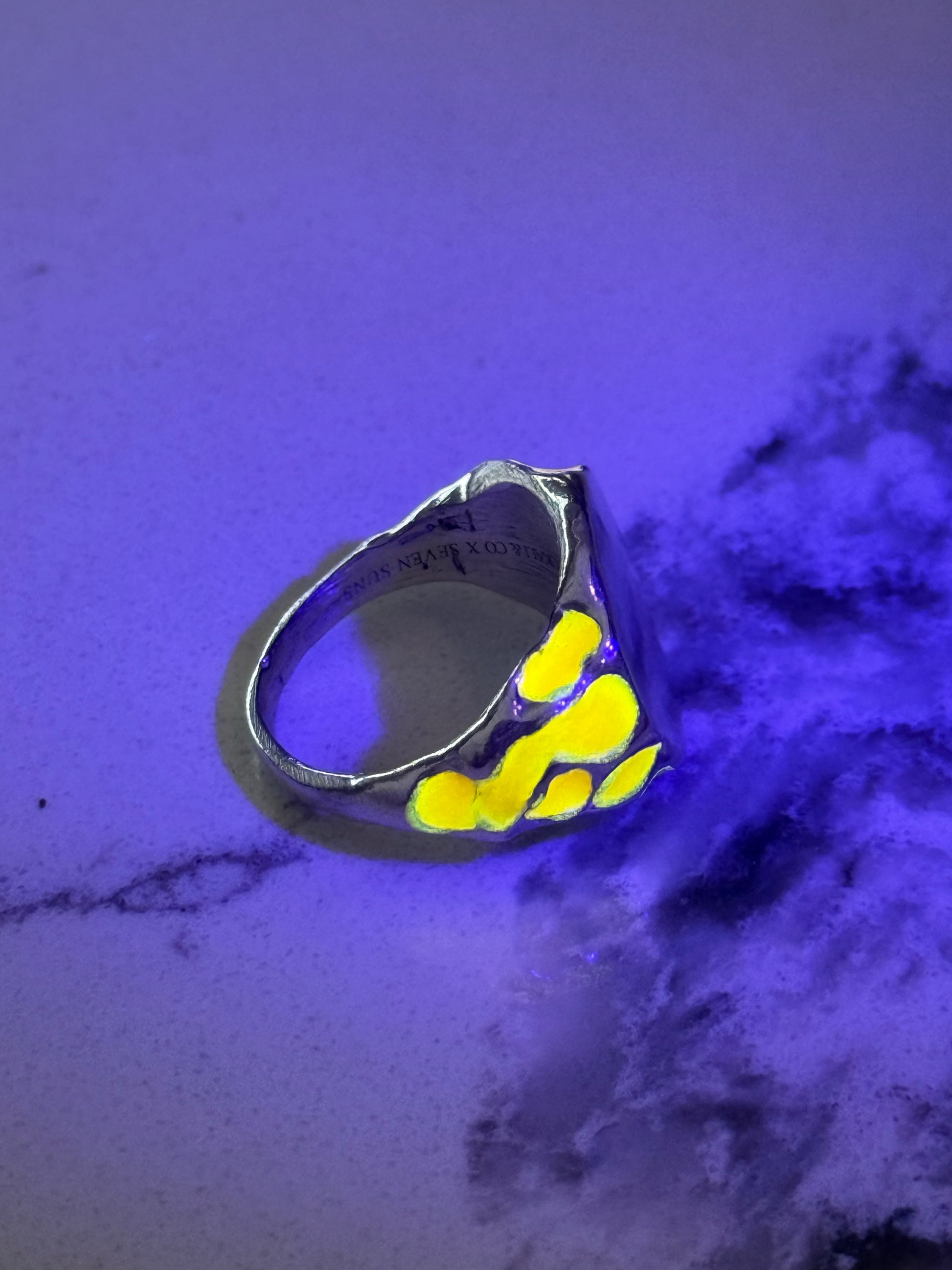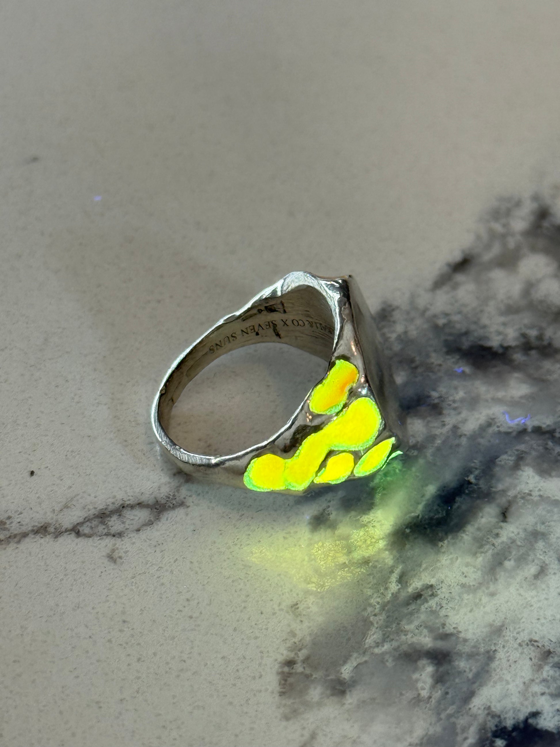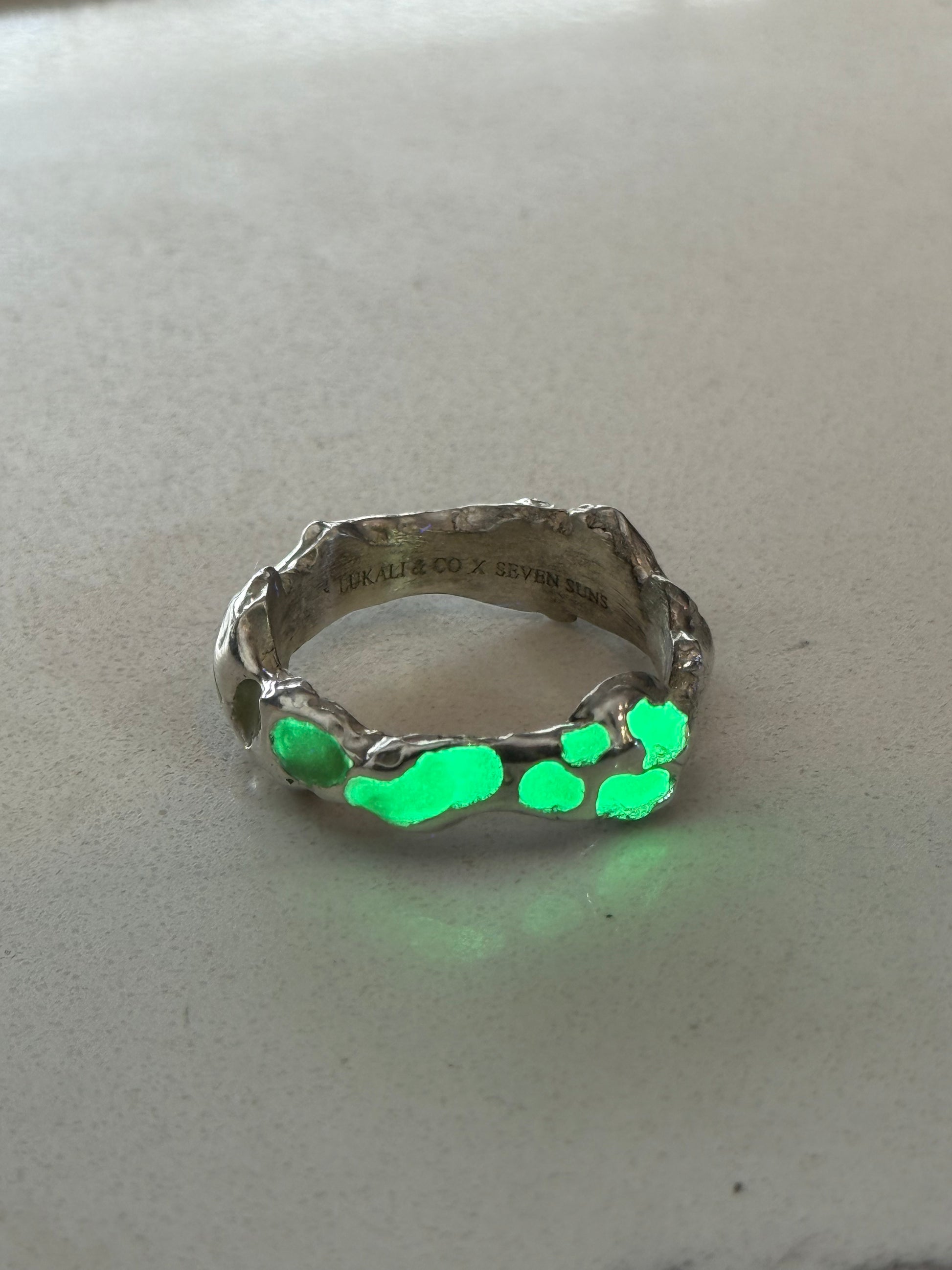 When Lukali saw what Seven Suns Jewelry was creating, it instantly sparked a vision. Their raw, meteor-like textures had that feeling of a relic that just emerged from the earthâs core. Pair that with the glow enamel weâve been perfecting, and it felt inevitable â we had to make it happen. A true âmeteor ring,â alive with light.