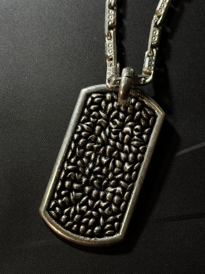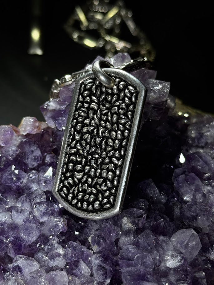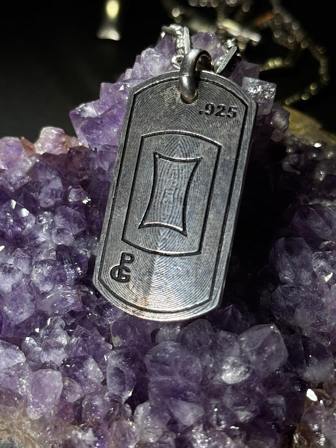 This one’s for when you want something lowkey, but with real texture. The Textured Tag Pendant is made from solid .925 sterling silver and features a deep, chaotic surface pattern on the front — rough, almost primal. The back is clean with a subtle engraved design, stamped with .925 to mark the metal.