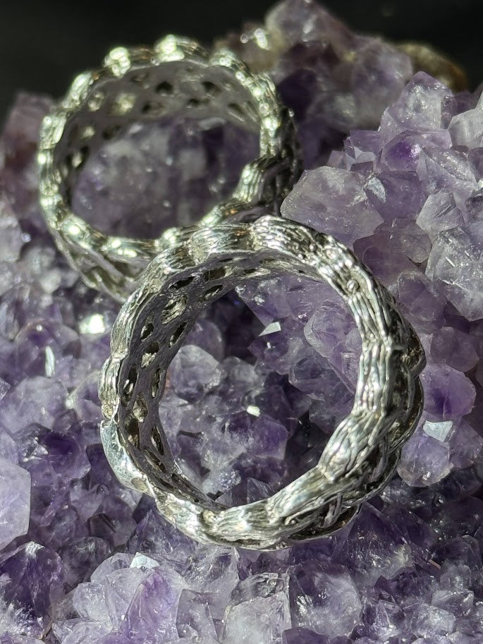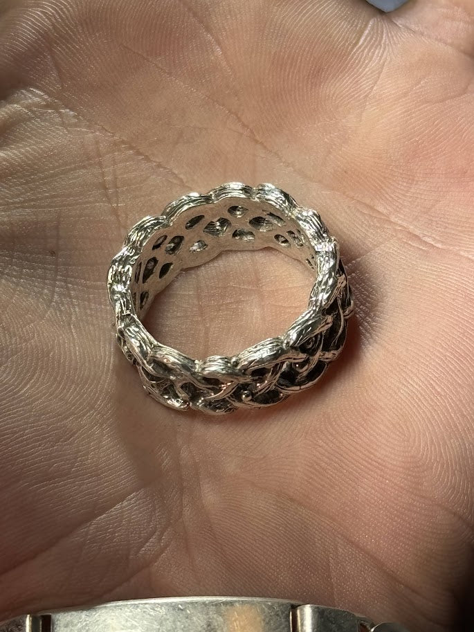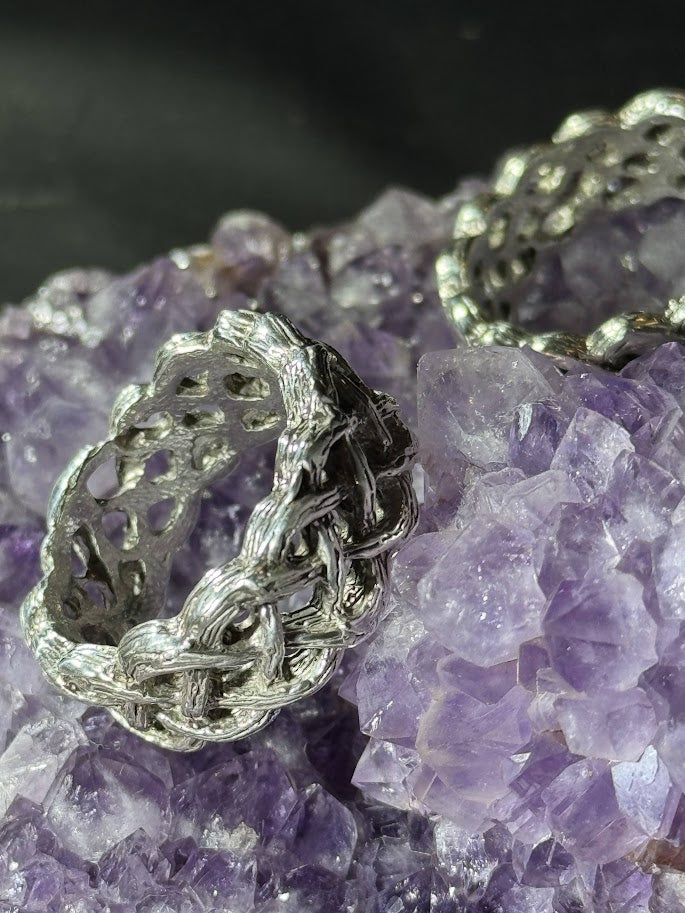 This ring's all about tension and texture. The Woven Core Ring is crafted from solid .925 sterling silver with an interlocked, rope-style center wrapped inside a forged outer shell. Every angle shows movement — like it's still in the process of becoming something.